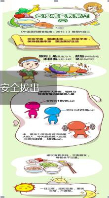 【吃动平衡,健康体重】原则上量出为入,鼓励多动会吃,不提倡少动少吃,忌不动不吃。对于成年人,轻体力劳动者每天能量摄入量男性为2250kcal,女性为1800kcal;中重体力劳动者或活动量大的人,每天能量摄入应适当增加300-500kcal。建议食物多样平衡膳食,每餐食不过量;一日三餐定时定量,重视早餐不漏餐。