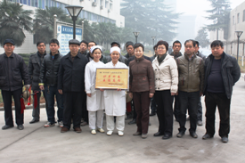 肝病住院楼和行政办公楼前,锣鼓喧天,喜气洋洋。原来是在医院五病科治愈出院的出血热患者张怀孝老人,亲自带领村里曾在北京表演过的专业锣鼓队,一路敲锣打鼓来到医院感谢五病科的全体医务人员,还亲自贴上了用大红纸书写的感谢信。并向党委书记和院长,诉说了他在五病科接收救治的过程和对五科全体医务人员的赞扬。当五病科经治医师从老人手里接过镌刻着妙手回春 医德高尚的金色牌匾时,老人用颤抖的声音说:谢谢,谢谢你们,要没有你们的救治,就没有今天的我了,今天我特地请了村里的锣鼓队,一路敲打表达我的感激之情。