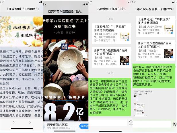 院纪委坚持每逢节日对纠治“四风”工作进行深入安排,重申纪律规定。按照中共西安市卫生健康委员会委员会转发市纪委监委《关于中秋国庆期间纠治“四风”工作的电话通知稿》的通知要求,召开纪委工作专题会议,要求各纪委委员按照责任片区加强监督,带头纠正“四风”,积极践行勤俭节约,防止“节日腐败”和“节日浪费”问题发生。持续层层传导责任压力,严格正风肃纪。